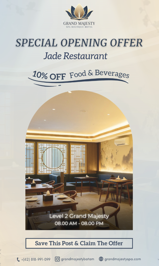 Discover the ultimate spa retreat at Grand Majesty Spa Boutique Hotel, Batam’s leading one-stop wellness destination. Step into an oriental sanctuary offering spa, hotel, restaurant, hot & cold plunge pools with sauna facilities. Stay for a full day of grand indulgence with invigorating massages, revitalizing facials, professional salon services, and beauty bundle packages to suit your every need.
