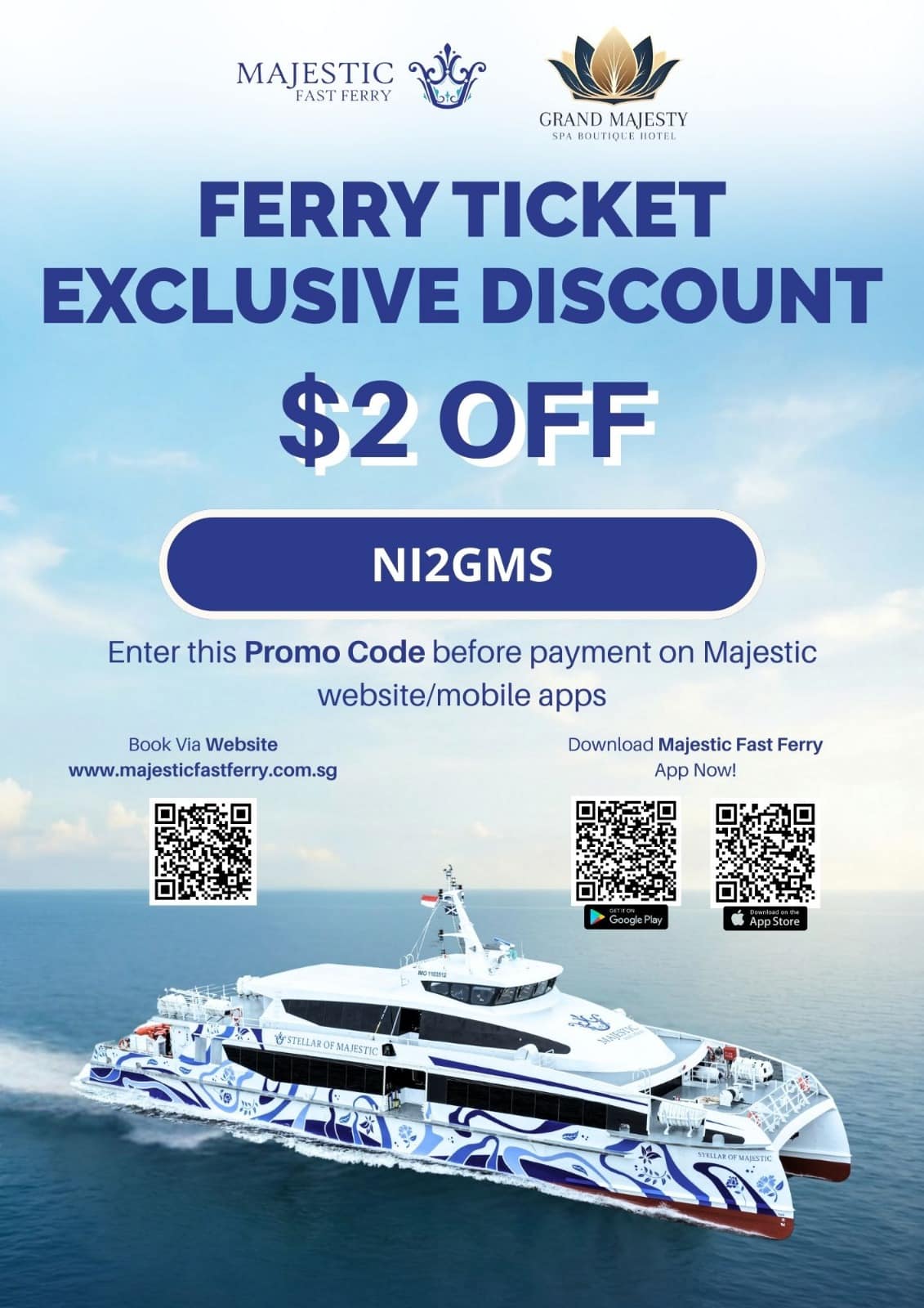 Enjoy a special $2 OFF your ferry trip to Batam with Majestic Fast Ferry.