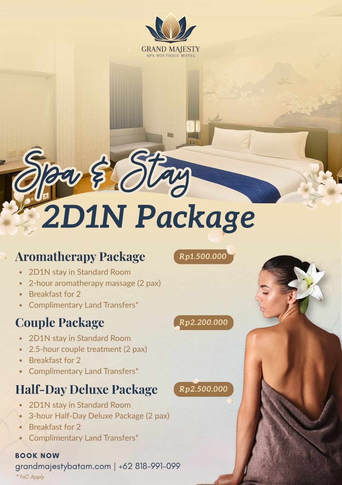Promo Spa Gift Voucher Share The Gift Of Relaxation And Rejuvenation. Contact Us Ferry Ticket Enjoy a special $2 OFF your ferry trip to Batam with Majestic Fast Ferry.Enter promo code: NI2GMSbefore completing your payment on the Majestic Fast Ferry Website or Mobile Apps Get Your Ticket Spa & Stay Package​ Save Up to 10% Off**Valid till 31st Dec 2025. Contact Us Birthday Special Free Massage Upgrade/Body Care**International Guest. Valid on your birthday month. Contact Us